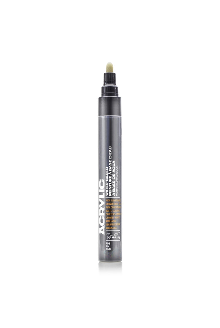 Montana Acrylmarker 2 mm . Dieser Montana Acrylmarker (2 mm, fein) ist ein hochwertiger, wasserbasierter Acrylmarker, erhältlich in 36 leuchtenden Farben, die den entsprechenden Farben der Montana GOLD Sprayreihe entsprechen. Die hochpigmentierte Farbe ist leicht, deckt hervorragend, ist wasserfest und abriebfest. Dadurch eignet sie sich für nahezu alle Oberflächen, darunter Leinwand, Papier, Holz, Metall und Stoff. Die Acrylmarker sind lösungsmittelfrei, ACMI-zertifiziert und tragen das AP-Zeichen, ein Garant für Ungiftigkeit.